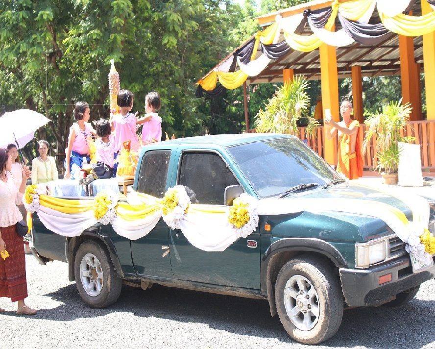 - ทำพิธีถวายต้นเทียน ผ้าอาบน้ำฝน